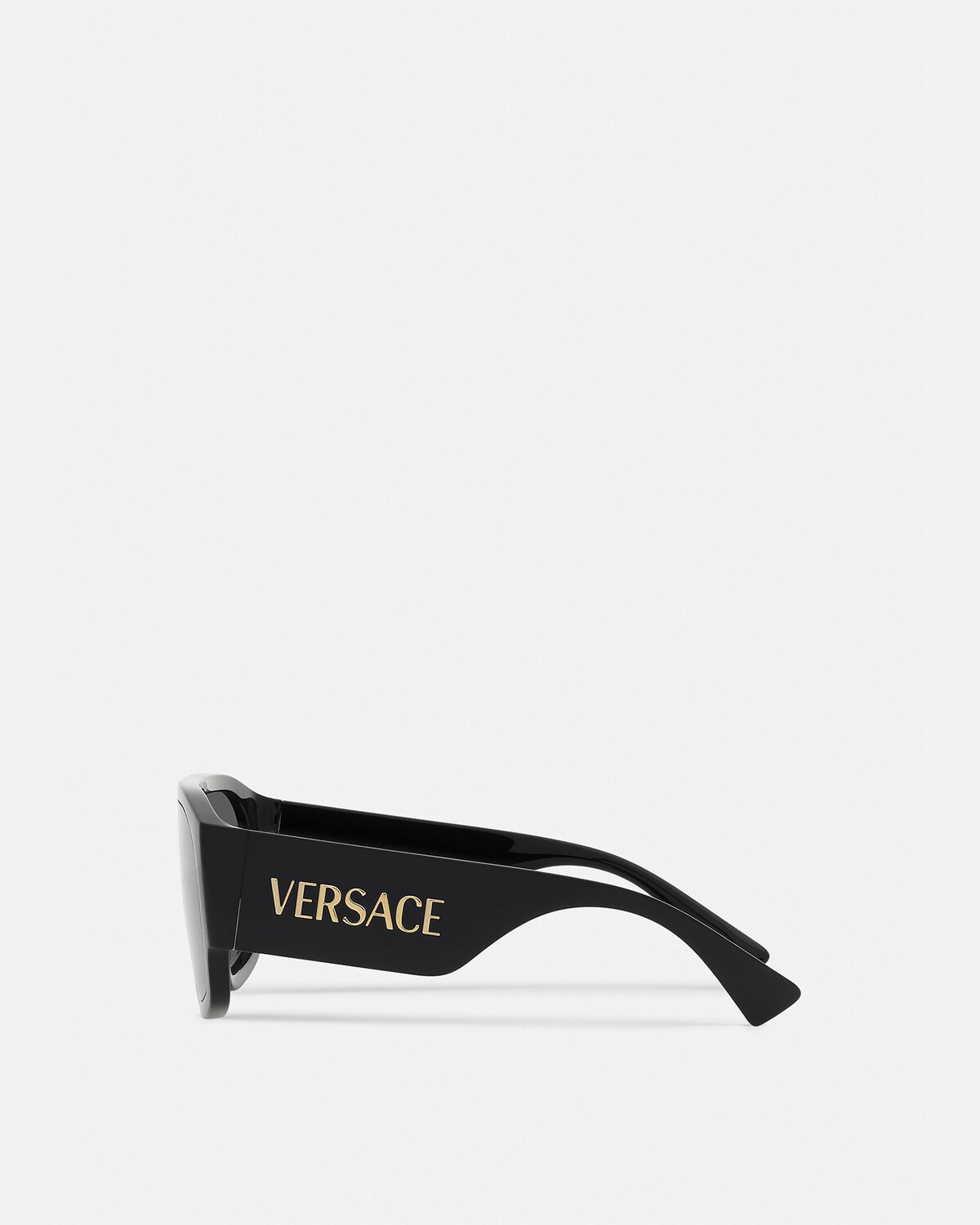 A statement runway style, these thick acetate, shield sunglasses, are accented by side Versace lettering.