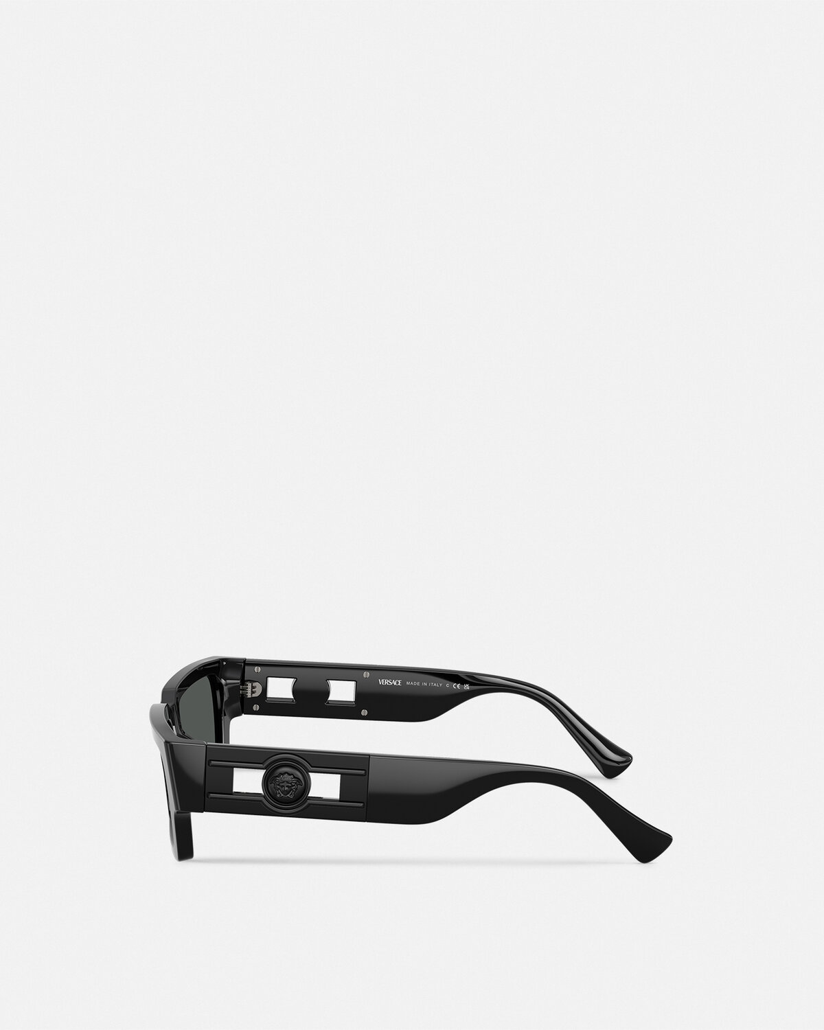 Rectangular sunglasses defined by geometric lines, accented by a Medusa hardware at the side.