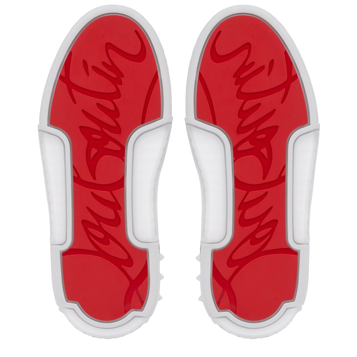 Showcasing an array of Maison Christian Louboutin signature details, the Astroloubi Strass for women is inspired by the basketball sneakers of the 90s. This sophisticated style blends silver glitter calf leather with metallic suede and strass. A lightweight, sporty design, this model is finished with a Loubi red heel tab. It features spikes at the back and a CL varsity monogram on the side.