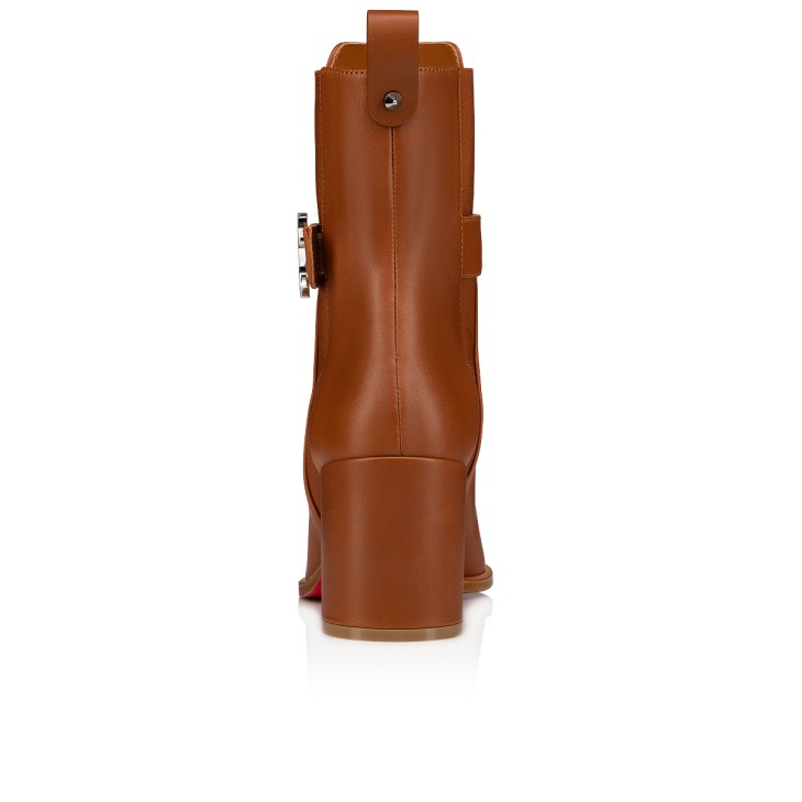 The CL Chelsea booty boot showcases clean lines and timeless elegance. With its almond shape and elastic insert on the side, it is crafted in Cuoio brown calf leather. Set on a 70 mm heel, it has a strap with a silver metal CL monogram. This urban style features a heel tab adorned with a Maison Christian Louboutin signature spike.