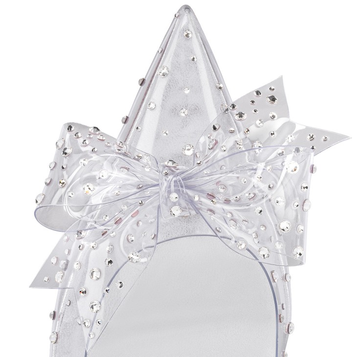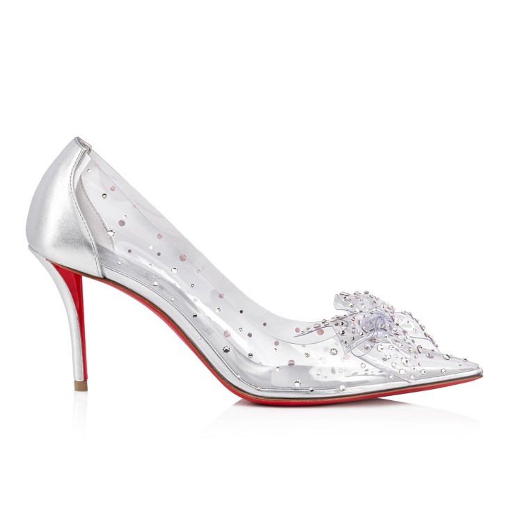 The Jelly Strass pump has a pointed toe and is packed with signature Maison Christian Louboutin details. Set on an 80 mm stiletto heel, it is crafted in silver laminated leather. The daring low-cut vamp features a PVC bow. This sophisticated, transparent pump is adorned with hand-placed strass, making it ideal for occasion wear. It is part of the wedding capsule collection.
