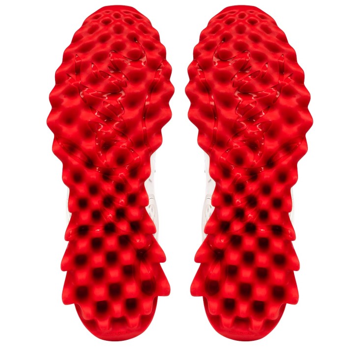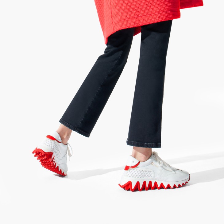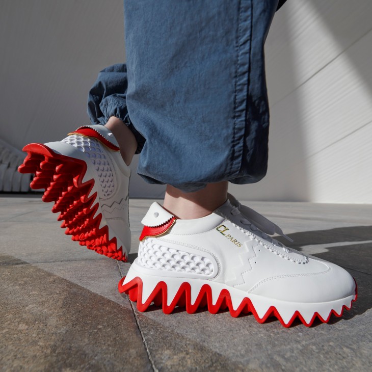 Cutting-edge design meets inimitable savoir-faire in the iconic Loubishark sneaker. This season features a carryover version in all-over Bianco white calfskin leather with signature red on the heel tab. The multi-piece construction is enhanced with a zigzag detail, tone-on-tone openwork heel counter and gold CL Paris varsity logo. The master stroke comes in the form of a serrated sole mimicking shark’s teeth, highlighted with signature red.