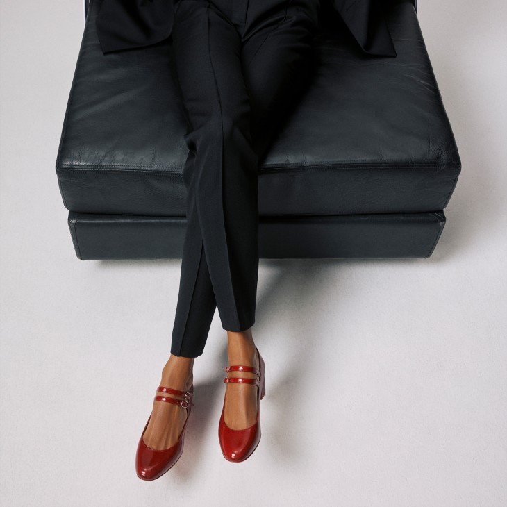 The Miss Jane pump is distinguished by its bevelled, wide 55 mm heel. Entirely crafted from Vog Loubi red patent leather, it features a rounded toe and Maison Christian Louboutin’s signature audacious vamp. Two slender straps with a metallic clasp delicately adorn the foot. The “Vog patent leather” material, being more flexible, offers better suppleness. Its wrinkled effect may have slight variations between the photo and the product.