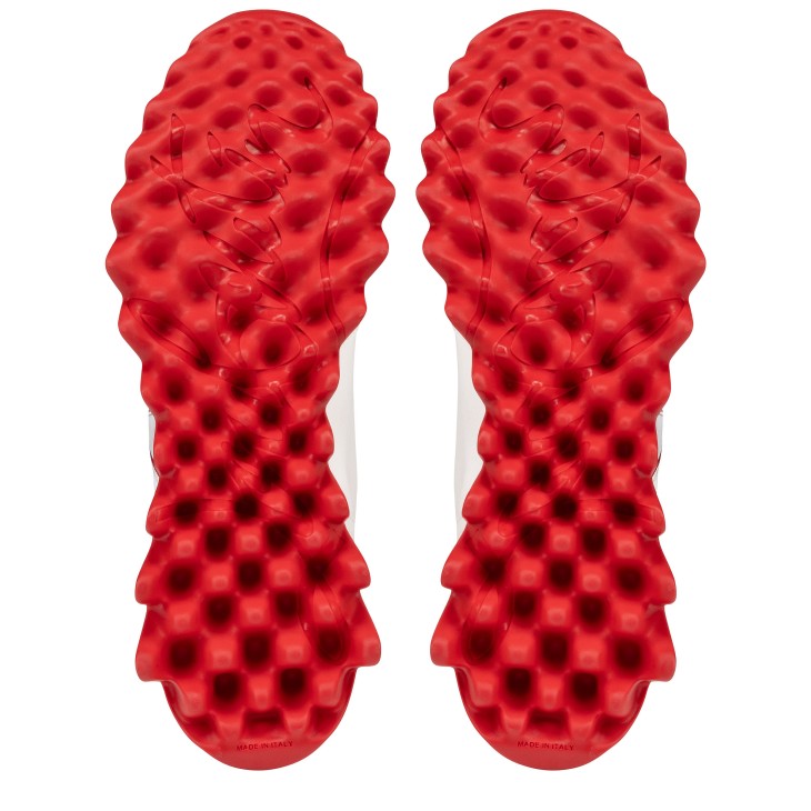 The Nastroshark sneaker for women has an audacious look. Inspired by the iconic Loubishark, it sits on a two-color rubber sole evoking shark teeth. This model in all-over white is crafted in calf leather and fabric. This sporty sneaker features a signature Maison Christian Louboutin three-color ribbon.
