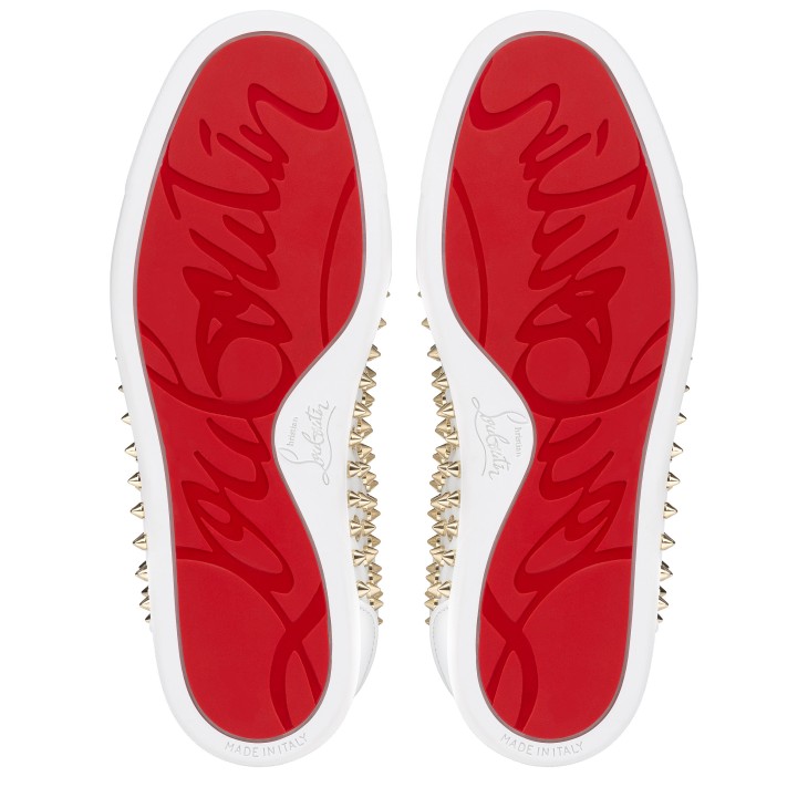 The timeless Vieira Night Spikes sneaker has an irresistibly bold design. This sneaker is crafted in supple white calf leather and has a black rubber sole. It features nappa leather trim for a sophisticated finish. It is adorned with all-over Maison Christian Louboutin signature gold spikes.