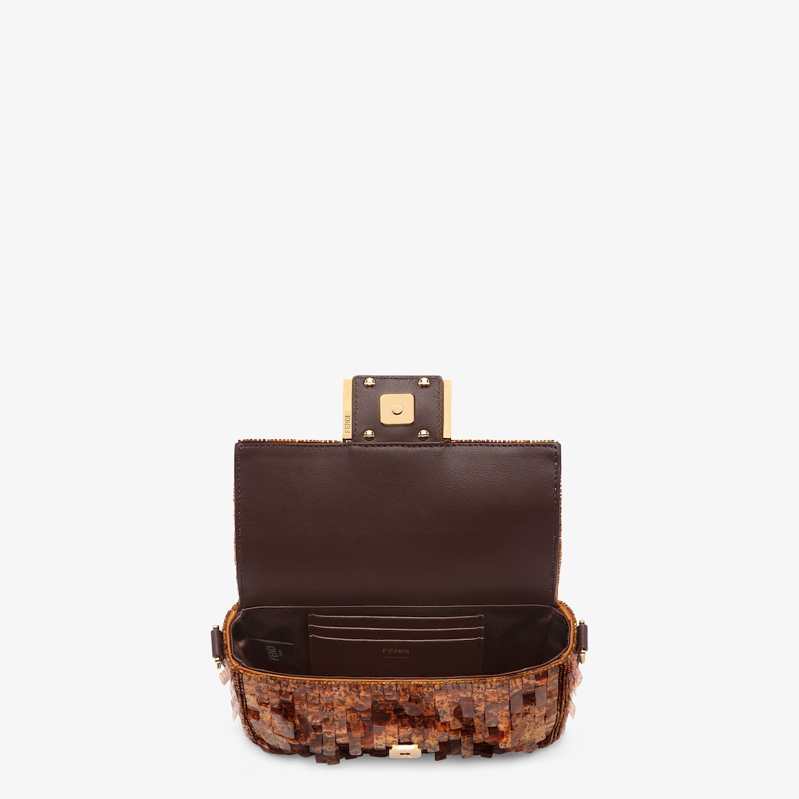 Iconic small Baguette bag hand-embroidered with brown, tortoiseshell-effect sequins of different shapes and sizes. Trimmed in brown calfskin and embellished with an FF clasp with plexiglass filling.