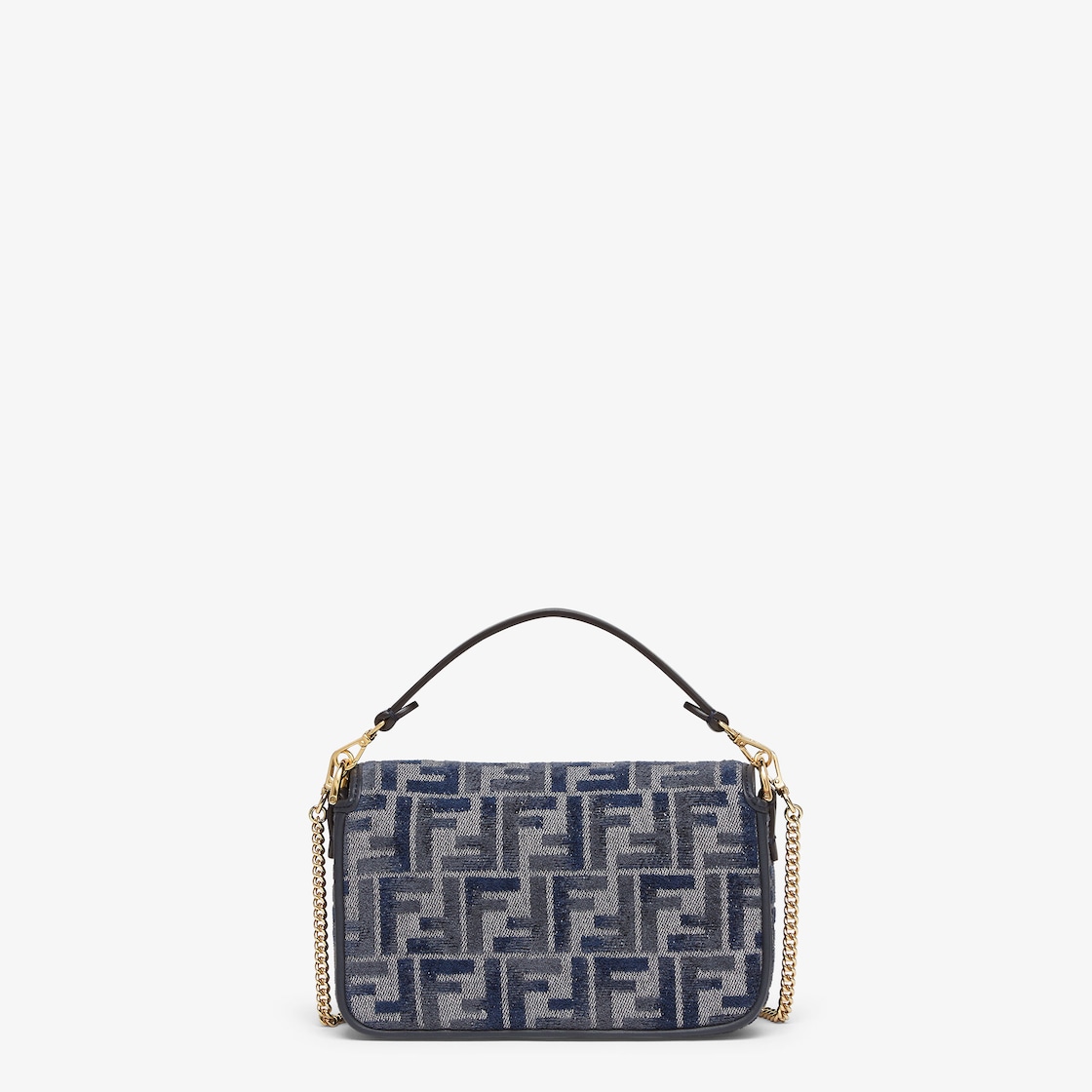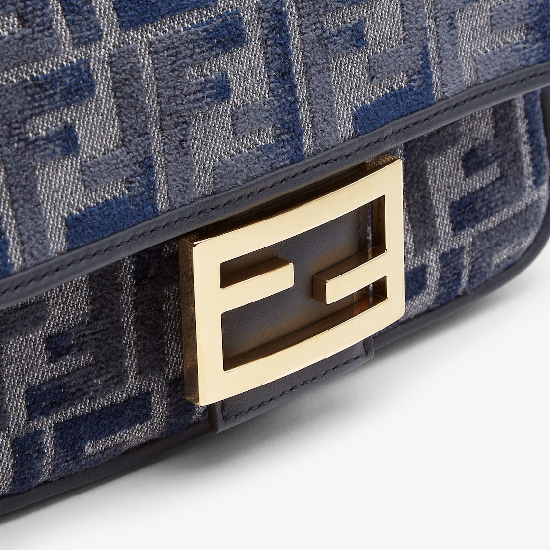 Small iconic Baguette bag made of chenille with the iconic FF motif in dark blue gradient tones, embellished with dark blue calfskin trim and decorated with an FF clasp.