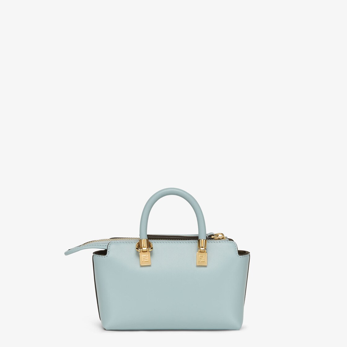 Iconic mini By The Way Boston bag, made of light blue leather with hot-stamped FENDI ROMA lettering and tone-on-tone leather tubular handles. Zip fastening.