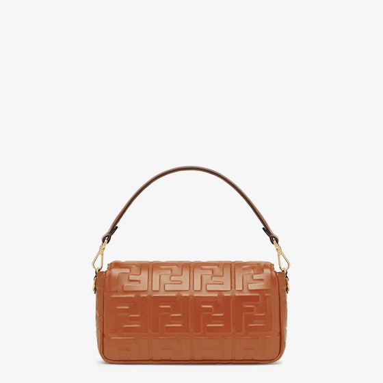 Iconic medium Baguette bag made of soft, brown nappa leather with a three-dimensional texture embossed FF motif. Decorated with an FF clasp.