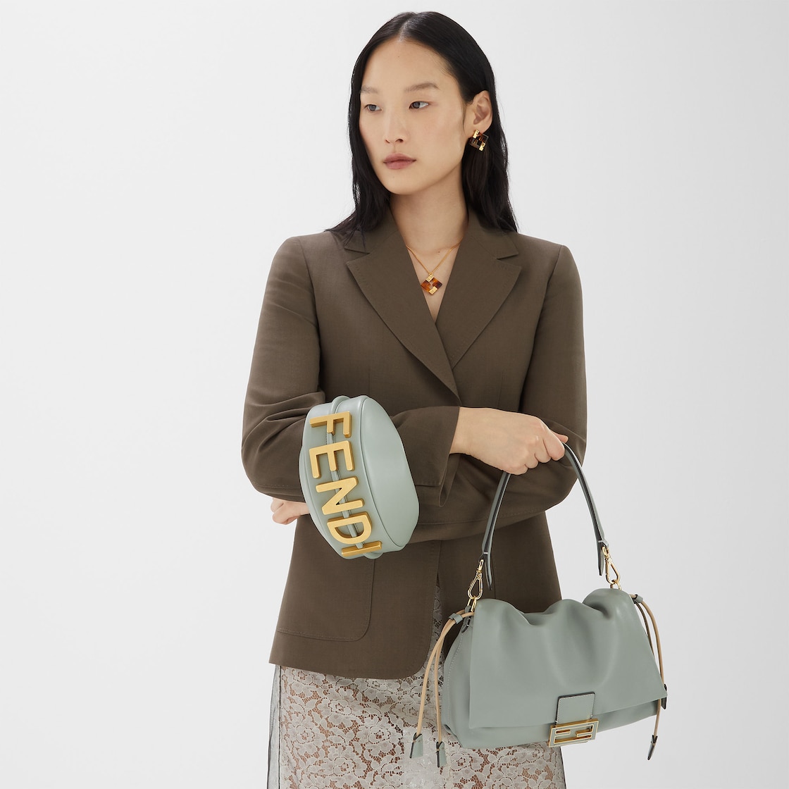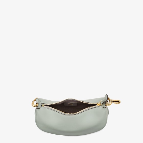 Made of matcha green calfskin, decorated with vintage gold-finish metal FENDI lettering on the base, visible when the bag is worn.