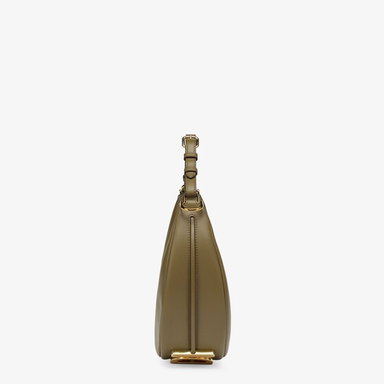 Made of soft green calfskin, decorated with vintage gold-finish metal FENDI lettering on the base, visible when wearing the bag under the arm.