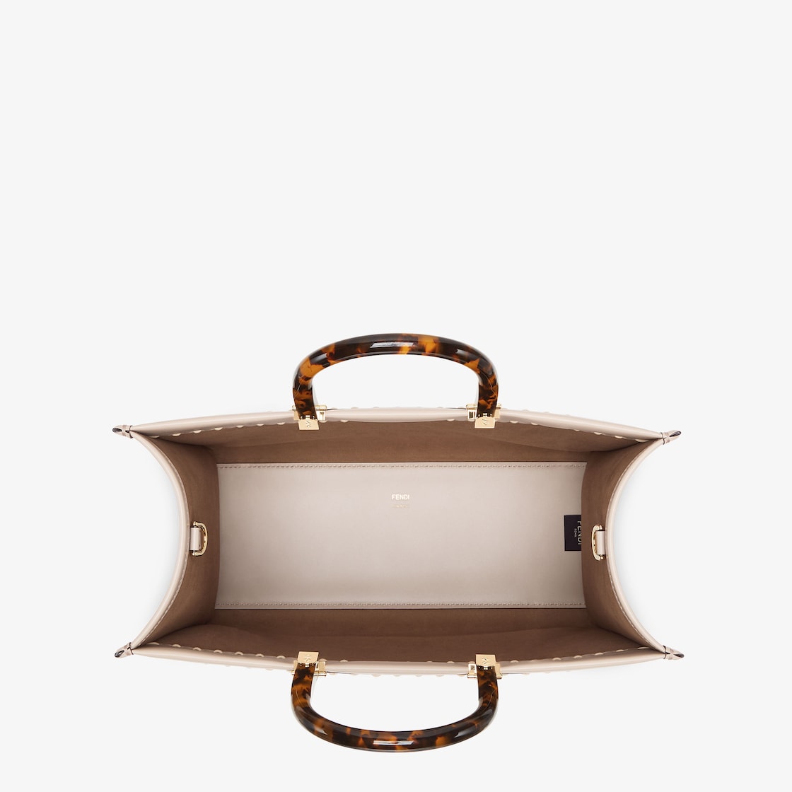 Medium Sunshine Shopper bag made of beige leather, with “FENDI ROMA” lettering appliqué in python-look printed elaphe and stiff tortoiseshell-effect plexiglass handles.