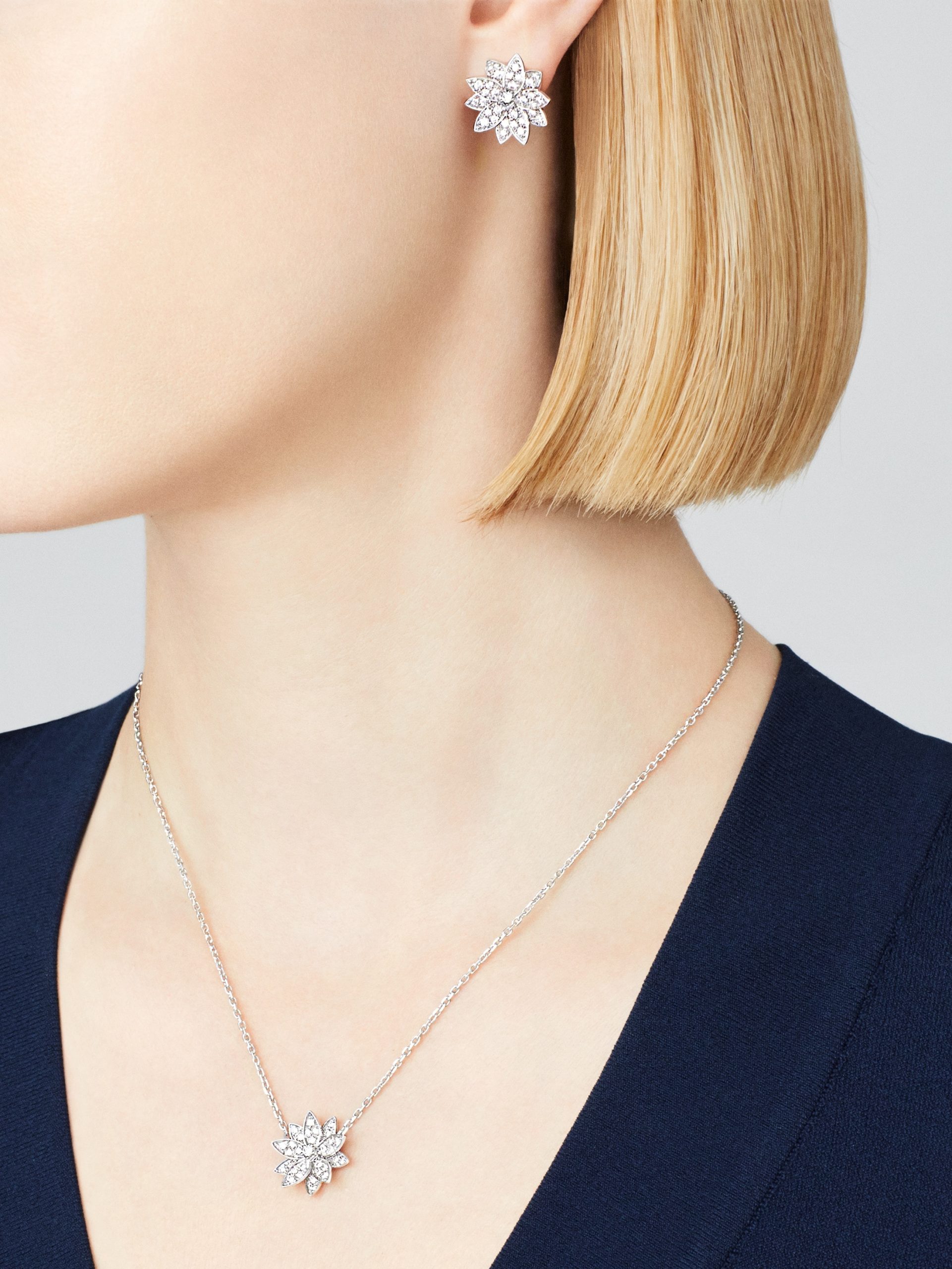 Frivole pendant, small model, rhodium plated 18K white gold, round diamonds; diamond quality DEF, IF to VVS.The pendant is attached to the necklace’s chain
